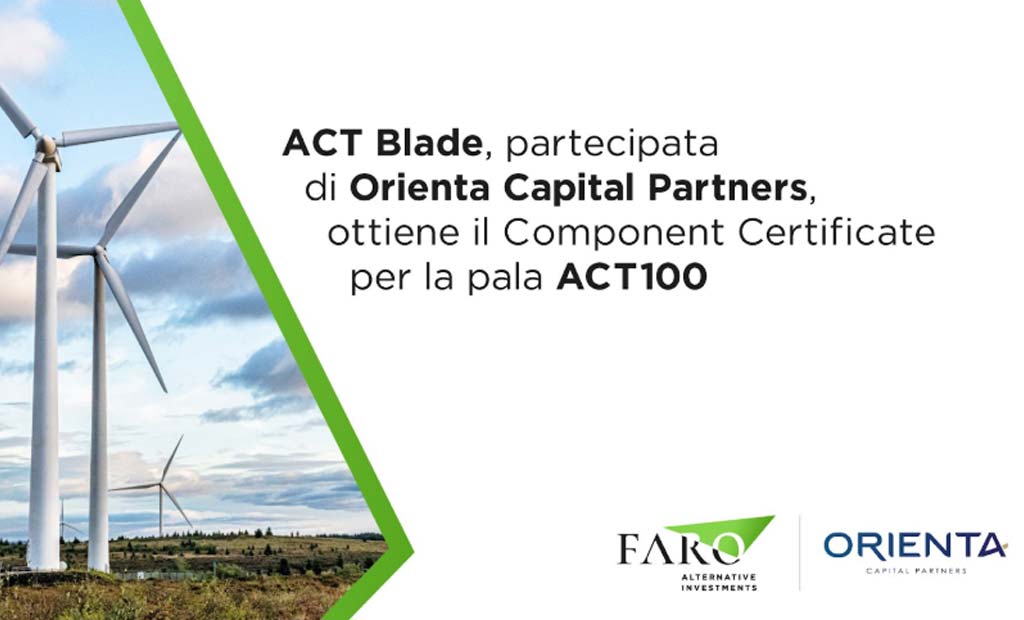 Orienta Capital Partners, Advisory Company di FARO Alternative Investments per il fondo FARO Real Economy, annuncia un nuovo traguardo per la propria partecipata ACT Blade, che ha ottenuto il Component Certificate per l’installazione delle prime pale eoliche ACT100 sulle turbine di una società energetica leader del settore. In un momento in cui la transizione energetica…